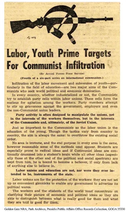We may never know how much of the Cold War hysteria – America’s second Red Scare – was deliberately created by reactionary elements in and out of government to demonize dissent and justify the permanent war economy. But we do know that the period included local and federal loyalty oaths; listings of over 150 suspicious organizations; the HUAC witch-hunt; the Hollywood blacklist; the Rosenberg trials and Joseph McCarthy’s wild accusations of treason in government. McCarthy never revealed the names on his famous list of “205 known communists” he claimed were working in the State Department. He didn’t have to; the damage – the terror – had been done.