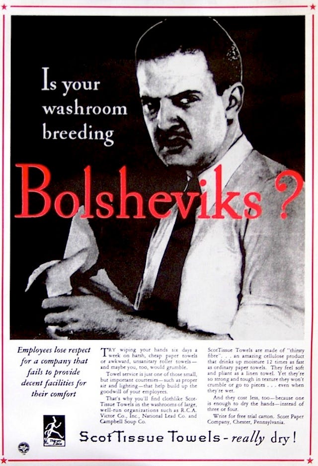 But class anger persisted. Capitalism desperately needed a diversion, a new external Other, and it found one with the birth of the Soviet Union. The New York Times blared, “Bolshevik assault on civilization… Menace to world by Reds…Reds seek war with America.” The U.S. and twelve other nations attacked Russia in an unsuccessful attempt to prevent consolidation of communist rule. Afterwards, compliant intellectuals inverted history (as I write in Old White Men: Historians as the Gatekeepers of American Myth, Part One of Eight); historian John Gaddis terms this invasion a “defensive” action.